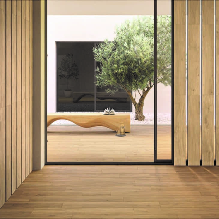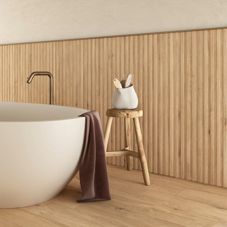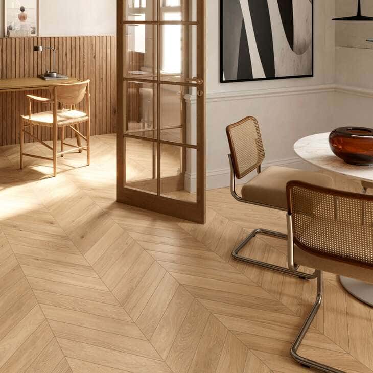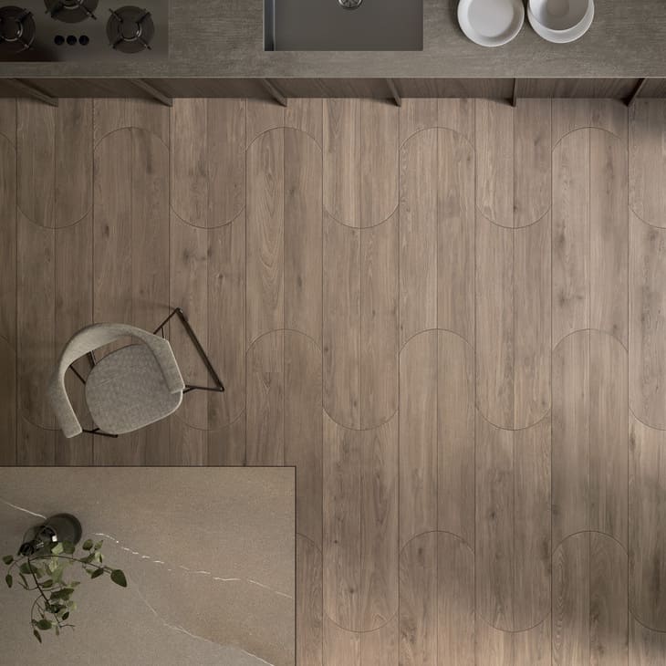 Il gres porcellanato effetto legno rovere dona un aspetto robusto e atemporale, con le sue venature lineari e nodi capaci di trasmettere un senso di calore e naturalezza. Si adatta sia ad ambienti classici che moderni.